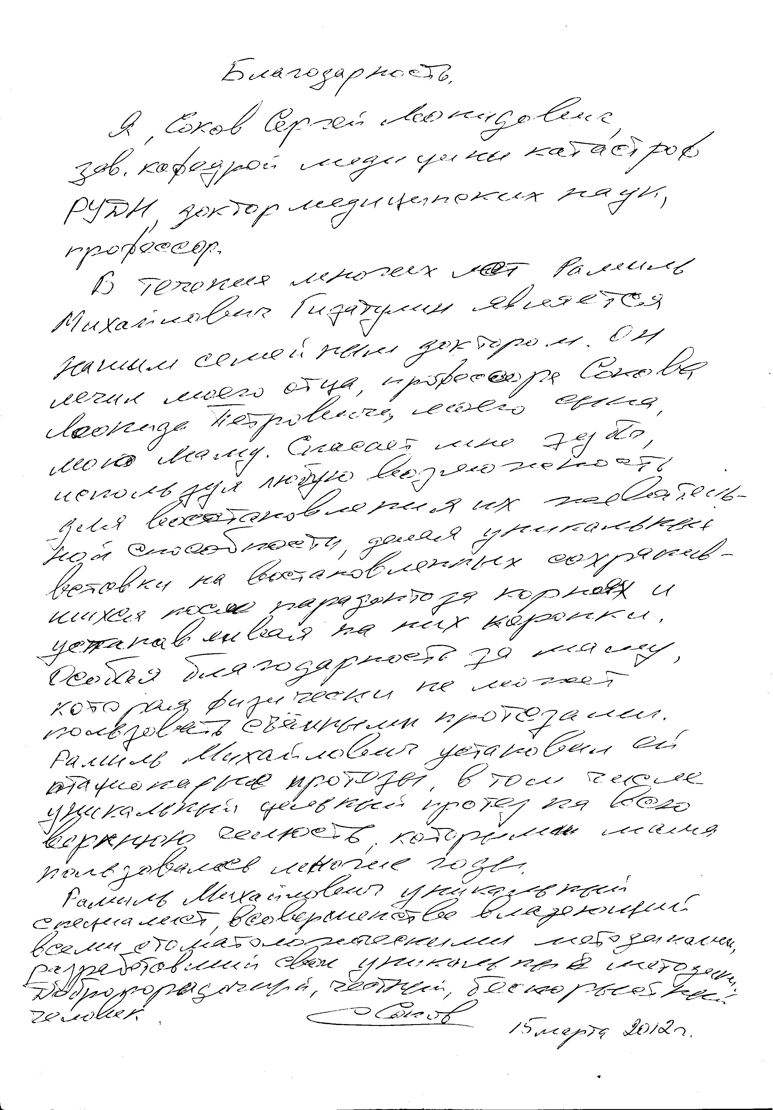 В течение многих лет Рамиль Михайлович Гизатулин является нашим семейным доктором. Он лечил моего отца, профессора Сокова Леонида Петровича, моего сына, мою маму. Спасает мне зубы, используя любую возможность для восстановления их жевательной способности, делая уникальные вставки на восстановленных сохранившихся после пародонтоза корнях и устанавливая на них коронки.